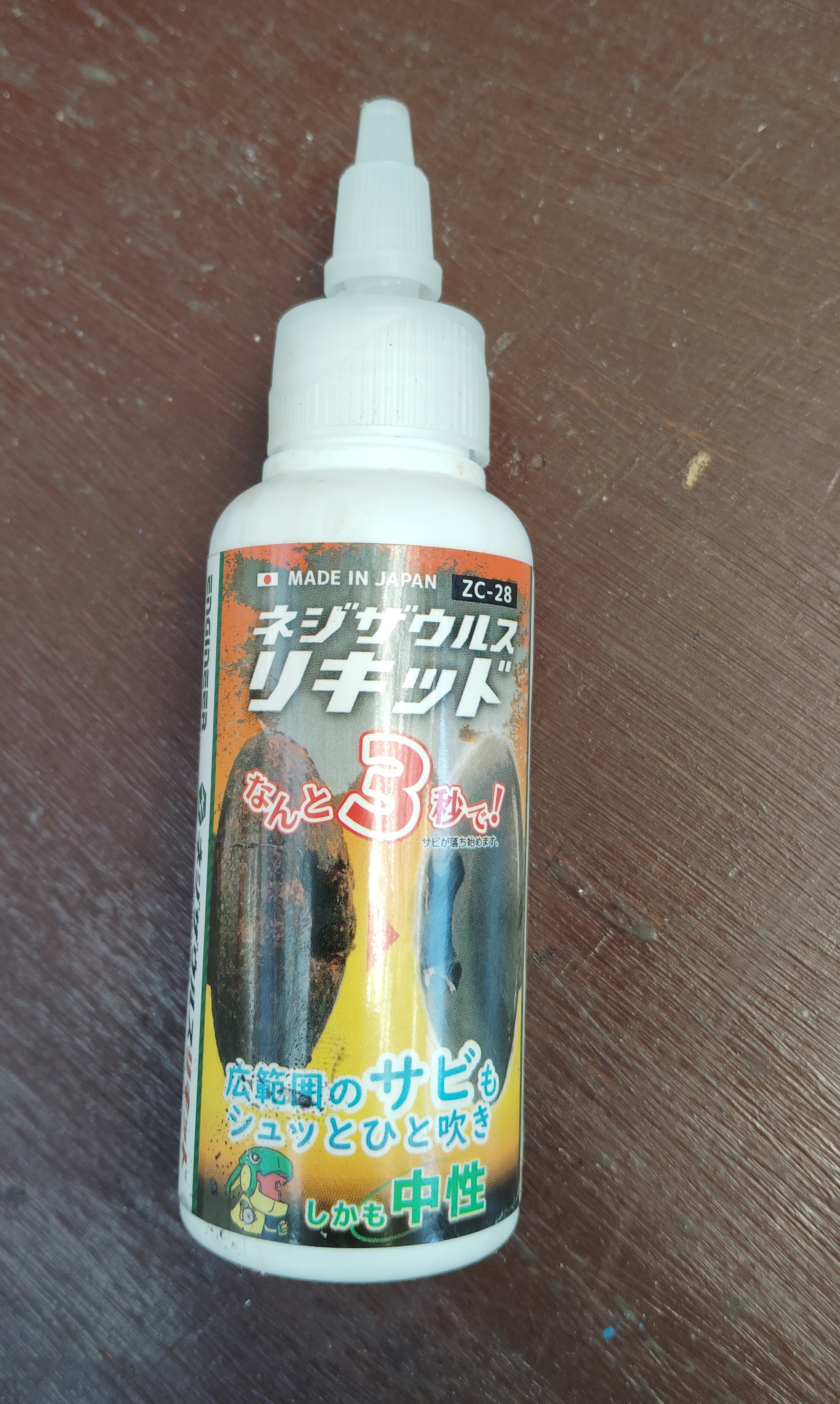 溶剤の名前はネジザウルスリキッドといい、3秒でさび落としが始まるとの謡い文句です。 実はKAZUMI号さんから依頼を受けたメンテナンスが補機のチルトアップが重いことへの対応でしたので、たぶん回転部が固着しているのだろうと、さび落としをホームセンターに寄って購入していたものです。 で、それを使って鍵穴に注入したところ、うたい文句の通り瞬く間に固着していたカギが開きました。