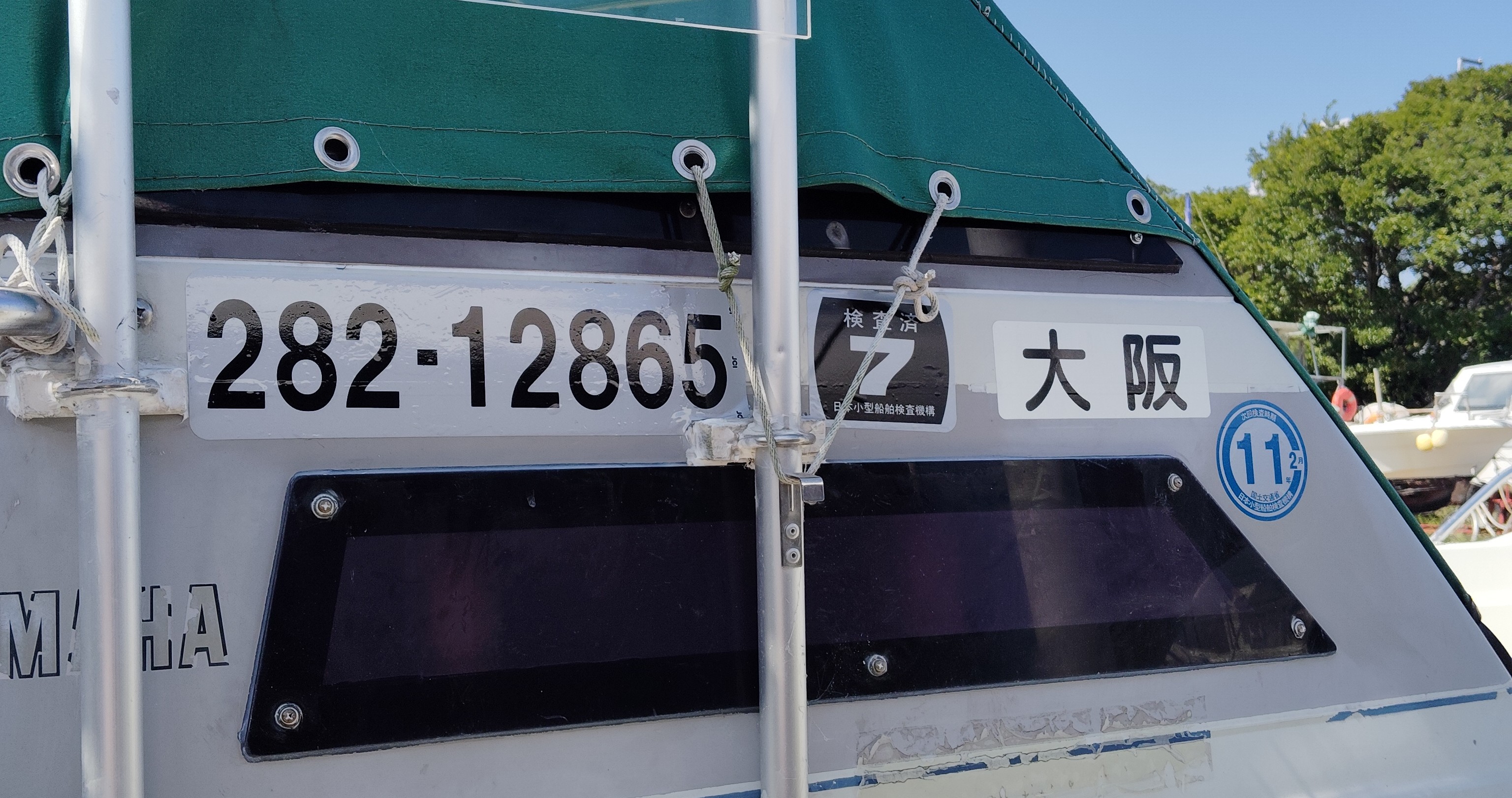 古い船体番号のステッカーは、一部がオーニングの支柱の影になっていて、検査時に指摘されないか気掛かりでしたが幸い何事もありませんでしたが、新しいステッカーは支柱個所を外して張り付けるべく、古いステッカーを剥がすことにしました。